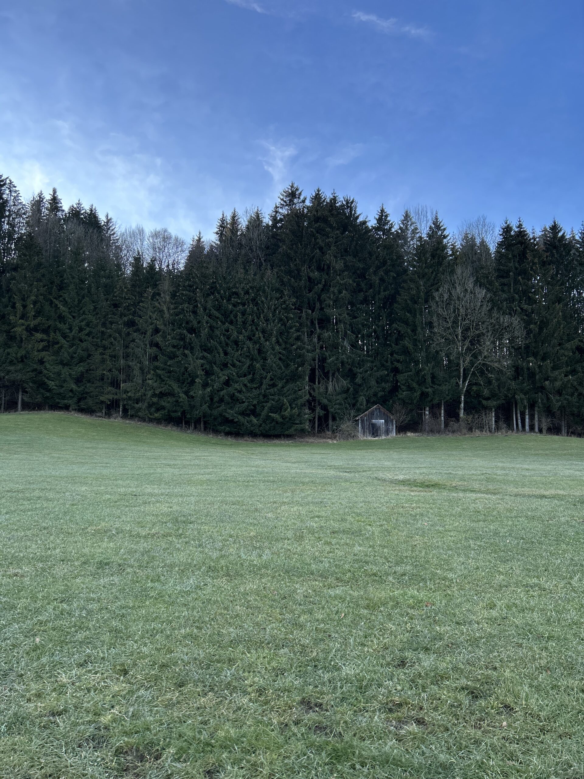 Im Wald ist es still, gedämpft, erdend. Dann öffnet sich der Weg, man tritt hinaus aufs Feld – Wintersonne, klare Kälte, der Blick reicht bis hinauf zum Schloss Kronburg.